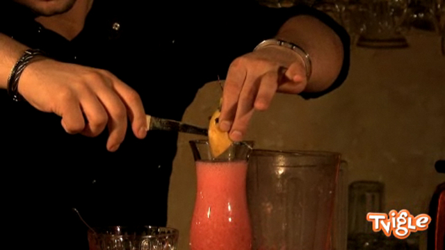Безалкогольный коктейль «Тутти–Фрутти».Состав:банан — 1/2;клубника — 1;клубничный джем — 2 ложки;вишневый сок — 40 мл;персиковый сок — 40 мл;ананасовый сок — 40 мл.